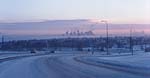 Down Bow Trail, turning east to approach downtown from the south. It was -26°C when I left home ten minutes ago. The sun's only been up for 15 minutes and twilight's hazy blue light softens the biting cold. The road is still snow-covered though broken by thousands of tire trails. Exhausted water vapour from all the home and skyscraper heating systems has condensed to ice crystals which hover in a cloud around the low-lying centre of Calgary. If this had been a weekday, I'd have travelled along this section of the road with a good deal more traffic, two hours earlier, while it was still quite dark.
