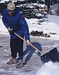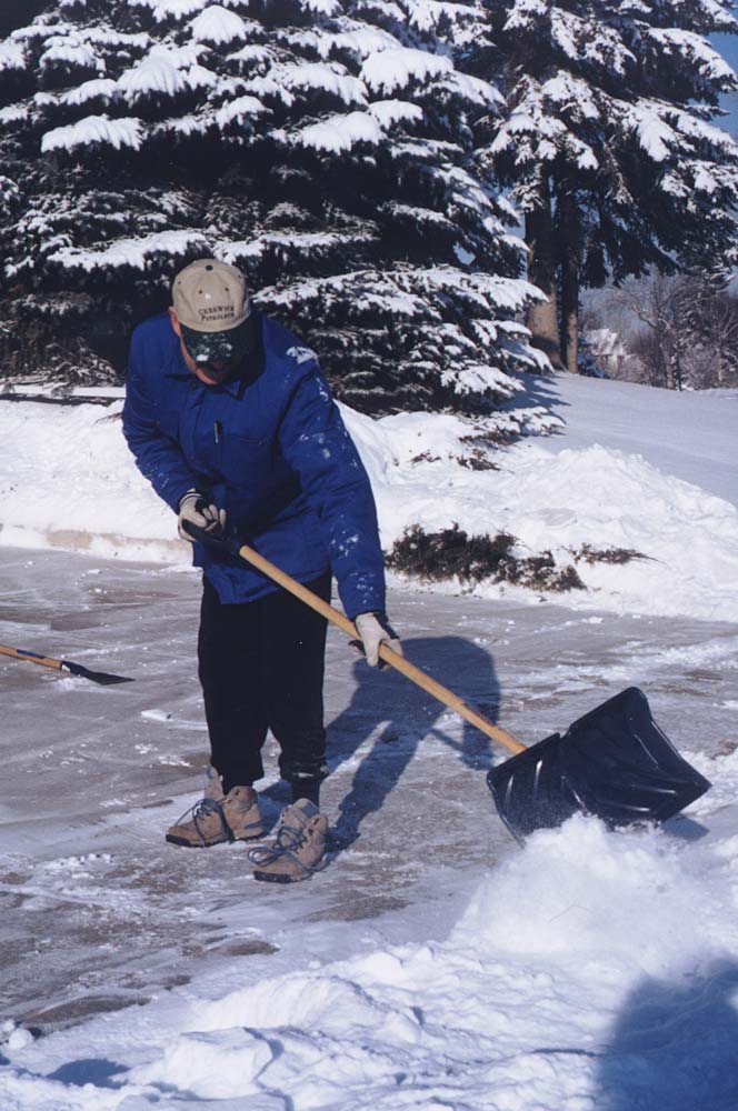 And here's a Calgary resident who's no doubt congratulating himself that his driveway-shovelling chore is almost done. You can see his ice-chopping blade lying on the driveway behind him. If one doesn't get to the shovelling soon after a snowfall then the feet of passers-by will have stamped a lot of the sidewalk snow into hard slabs or even sheets of ice that have to be slowly chipped away. And look at his shadow. Although it's almost noon the long shadow indicates that our winter sun is still very low in the sky.