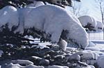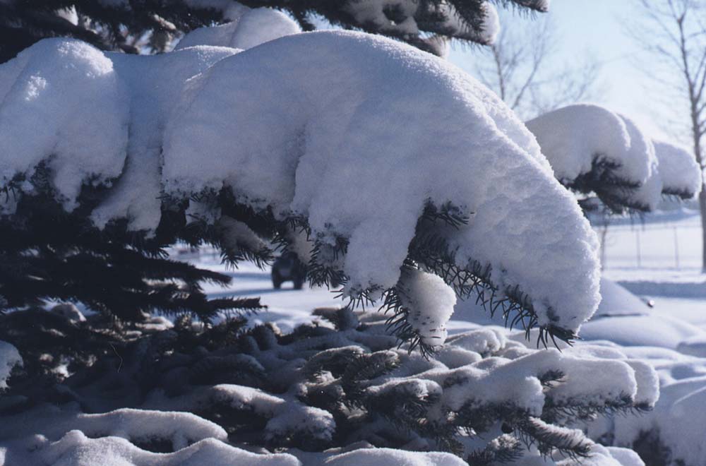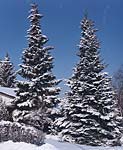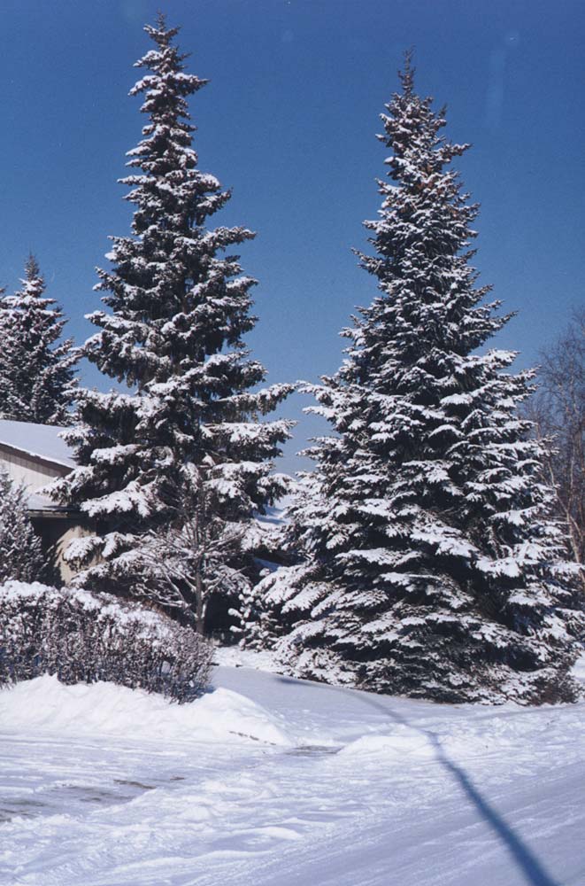 Spruce trees are a feature of many Calgary front yards. This pair, which are taller by far than the owner's house, line a driveway. Dry, powdery snow from the falls of the last two days still rest on their branches and is a special trap for the unwary.