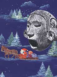 Well, it comes down to this... a Happy Christmas and Prosperous New Year to you all. This year I'm again trying another alternative to our formerly standard news-of-the-family letter. Recently I was reviewing the haiku [short poems in a style based upon a traditional Japanese form] from my major art project of the year and I realized that much of my life was leaking through them. In a way they had became a diary - though perhaps a rather surrealist one. So with suggestions from all the family I have chosen thirty or so to share here. Interspersed with them on the following pages are electronic copies of the Christmas cards we made by collaging old Christmas wrapping paper with found images and other materials. Cards were made by my son Julian (b.1984), by two of my daughters, Carol (b.1986) and Danielle (b.1989) and of course I made many myself. |